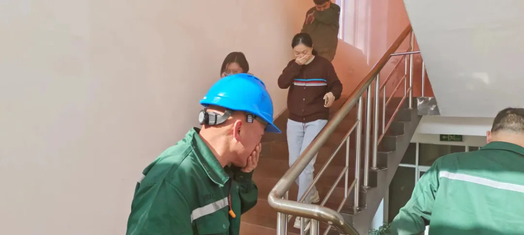 实景模拟一:发现三楼办公室火情、出现浓烟(专人负责放置烟雾弹),迅速启动消防应急救援预案、演练人员疏散转移。