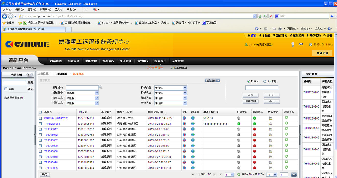 通过中央监控系统,凯瑞重工总部可直接控制每一台配有相关系统的机器,从而实现了对设备最新位置数据、车辆状况和报警信息的远程监控,实现与GIS数 字地图相匹配,直观显示车辆实时坐标,并对各种信息进行自动记录、分析和处理。通过授权,各个监控用户可以在世界各地,利用有线或无线方式上网,登录到监 控中心网站进行车辆信息的收发、查询、分析等工作,甚至可以直接下达指令,对授权车辆进行远程控制。