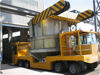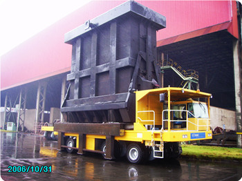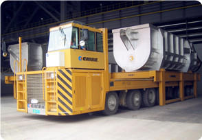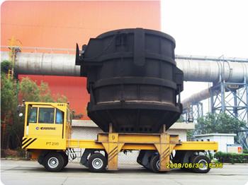 凯瑞重工自行设计、生产的废钢料篮/料槽运输车是一种大吨位特种运输车辆,可以实现转炉冶炼废钢的装、运、卸一体化集成作业,是钢铁冶金企业的重点配套设备。车辆设计应急转向系统,设置外接动力源接口,在车辆失去动力后,通过外接动力源提供转向动力,实现应急转向。针对转向系统元器件的损坏,在设计时充分考虑维修性,缩短维修更换时间。实现多种转向运行模式液压悬挂,保证行驶中各轮组载荷均担具有整车同步升降和水平度调节功能具有自动称重和重心显示系统有高清晰度视频显示器,直观显示运行状况和参数基于CAN总线的PLC控制和故障在线诊断提示系统载重量大,操控灵活,运行可靠.在铁水运输方面,凯瑞重工的ET系列液压平板框架运输车在国内多个大型项目中被采用,积累了大量技术及运营经验。