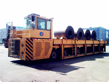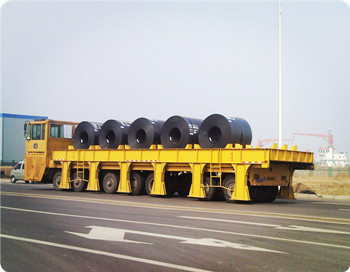 凯瑞重工的液压升降平板运输车、框架运输车可用来将诸如方坯和板材等的半成品从连铸车间运输至存藏车间,或是送至轧钢厂做二次处理,电镀或涂装车间。这类液压升降平板运输车同时可用于运输成品,如:板材、大型部件、钢卷等。最后将成品从存藏车间运输至码头装船,有效提高靠近海港的冶钢工厂的运输效率,较之传统的有轨运输方案,由于减少了起重设备,节约了存储空间,从而有效降低了成本支出。